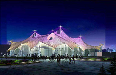 1、 極具表現力的建筑形態:具有特定功能的建筑都可通過立意得以表達,張拉膜結構的獨特外形體現了建筑自身的自然美感。這些建筑形態本身和與其相協調的傳統建筑一起構成了令人興致盎然的地面標志性建筑。優秀的膜結構設計是結構與外形的有機融合,使其顯得了類拔萃,同時與自然環境、歷史及現代的城市景觀有機結合。輕型結構可以看成是大型的雕塑作品,可為其周邊空間增添活力,成為周圍環境的補充和焦點。
